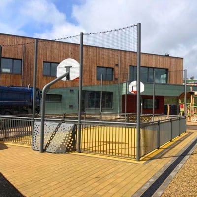 En serie ballbinger i varmgalvanisert stål, som fås i ulike standardstørrelser. Disse bingene er laget av vår lekeplassprodusent.