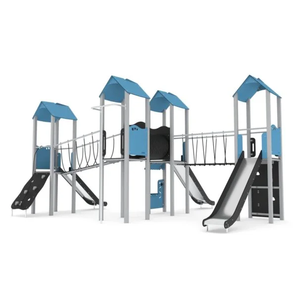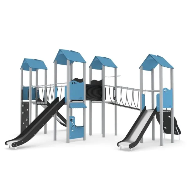 Lekestativ med 4 plattformer og 3 sklier. Adkomst til plattformer via vertikal eller diagonal klatrevegg.
