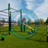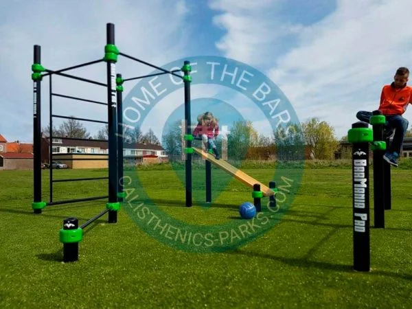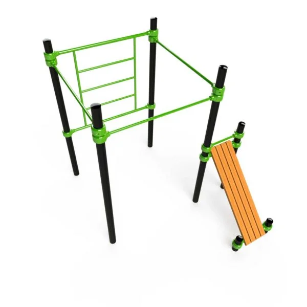 Kubeformet stativ med ribbevegg, pullup-stenger og situpsbenk.