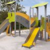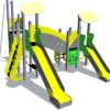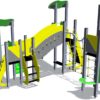 Et innholdsrikt klatrestativ med tre plattformer, to sklier i i ulik høyde og et vertikalt klatrenett. Barna kan ta seg opp til plattformene via skrå klatrevegg med grep eller via trapp med gode håndtak. På stativet finnes også flere benker, et lekepanel og brannmannstang.