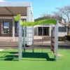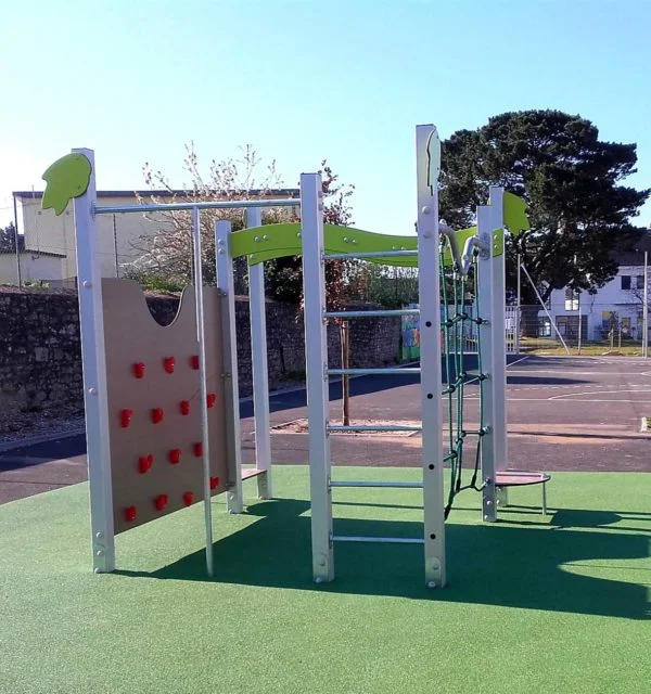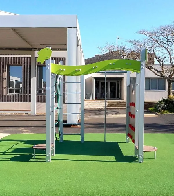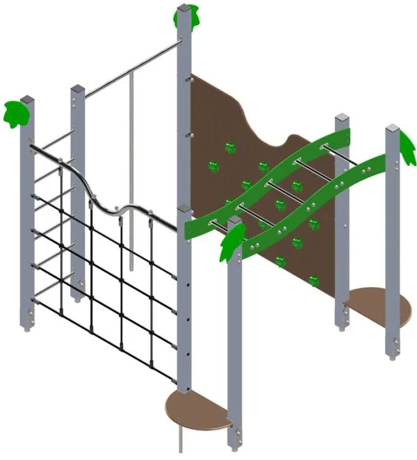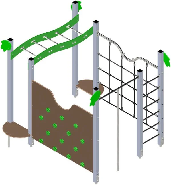 Innholdsrik klatrekube i aluminium. Armgang, klatrenett, klatretau og klatrevegg. Her er det mye aktivitet på lite plass!