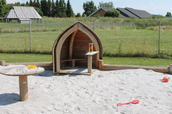 Søtt lekehus med disk og benk, for 3 brukere. Alder: 1+ år.