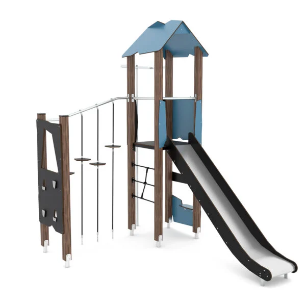 Et mindre stativ som allikevel byr på gode utfordringer innen motorikk og balanse. Med klatrevegg, svevende plattformer, brannmannstang, sklie og butikkdisk under plattformen.