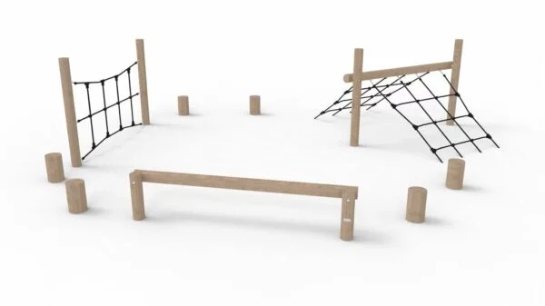 En liten balansebane med diagonale og vertikale klatrenett, balansestokker og balansebom. Løypa er satt sammen slik at det skal være mulig å ta seg gjennom alle apparatene uten å være nær bakken.