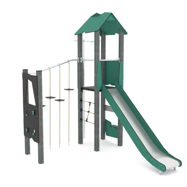 Et mindre stativ som allikevel byr på gode utfordringer innen motorikk og balanse. Med klatrevegg, svevende plattformer, brannmannstang, sklie og butikkdisk under plattformen.