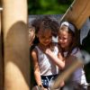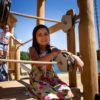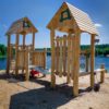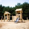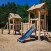 Aktivitetshus med sklie i rustfritt stål, bro, 2, sandlek mm. Sikkerhetsareal 43,9 m². Fri fallhøyde 90 cm. Alder: 2-14 år.