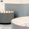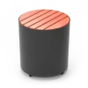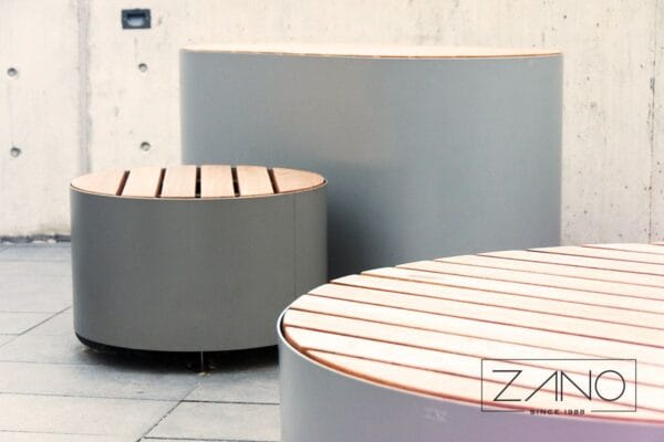 Rund benk i rustfritt stål og tre. Ø: 64cm, H: 72cm
