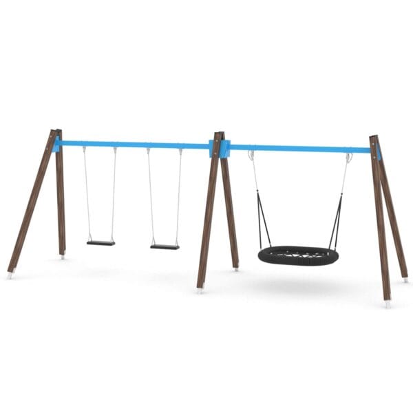 Huskestativ med 2 vanlige seter og en fugleredehuske, i impregnert kjernefuru. Velg mellom ulike setetyper (se produktdatablad for mer informasjon).